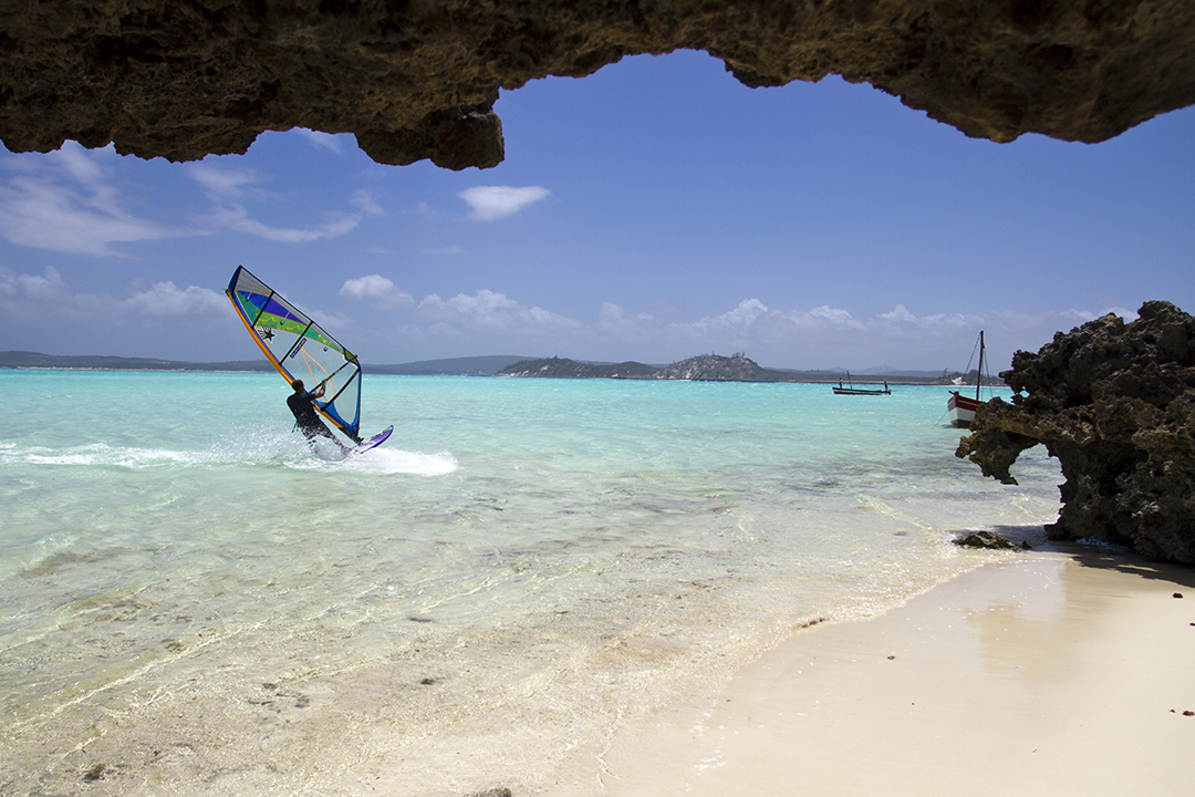 I cannot catalog every near-disaster. The Emerald Sea and Bay of Sakalava both offer really consistent good windsurfing: starboard tack side-onshore with head high waves every single day. But the best spots for photos and film are more difficult to reach and surf. We needed a boat to get to most of the spots, but we never had the right boat. One of the boats capsized, throwing us into the swells. Babaomby Lodge made a deal with me for 3-day-use of a jet ski for filming but did not deliver. Some of the local French tried to sabotage my trip by spreading rumors in town that I was a fake pro windsurfer—an imposter not to be helped! Oh, and my photographer (flown in from San Francisco) wanted to windsurf instead of taking any photos—the waves and wind were too tempting.
